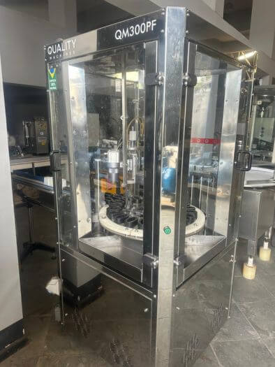 Envasadora rotativa com rosqueador e batocador, sistema de envase por pistões, toda em aço inox, cabinada. Quality machine, modelo QM 300 PF.