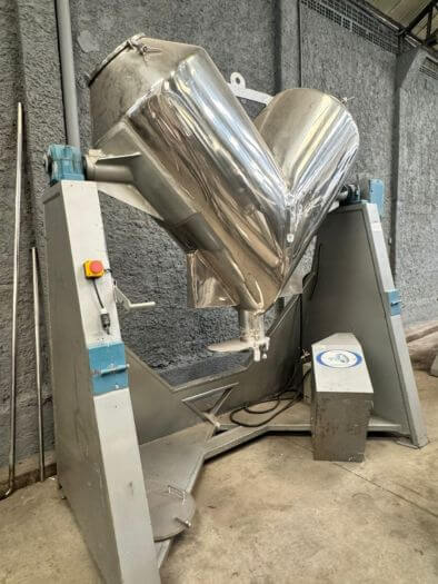 Misturador em V, capacidade de 900 litros, todo em aço inox, parte em contato com produto AISI 316, polimento espelhado, completo, válvula borboleta,