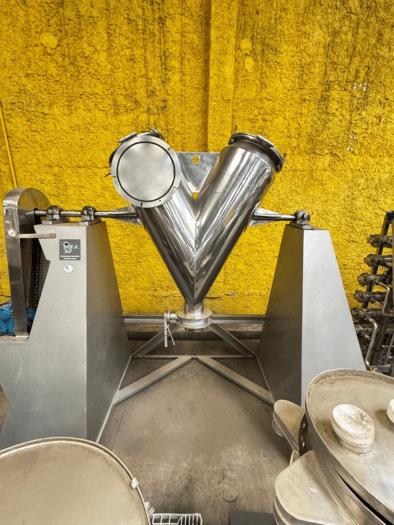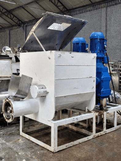 “Misturador ribbon blender, todo em inox, sanitário, com painel de comando e válvula dosadora. Capacidade de 95 litros.