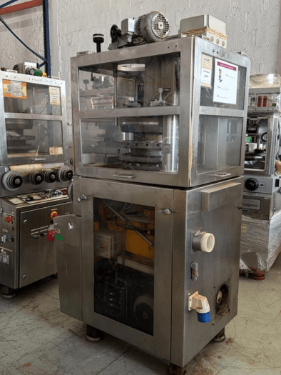 Compressora 10 punções FELLC, Modelo Rotativa (F10/8T), sistema de alimentação forçado de pó, acompanha 2 jogos (19×8,5mm -15mm pastilhas Padrão D), automação completa em funcionamento